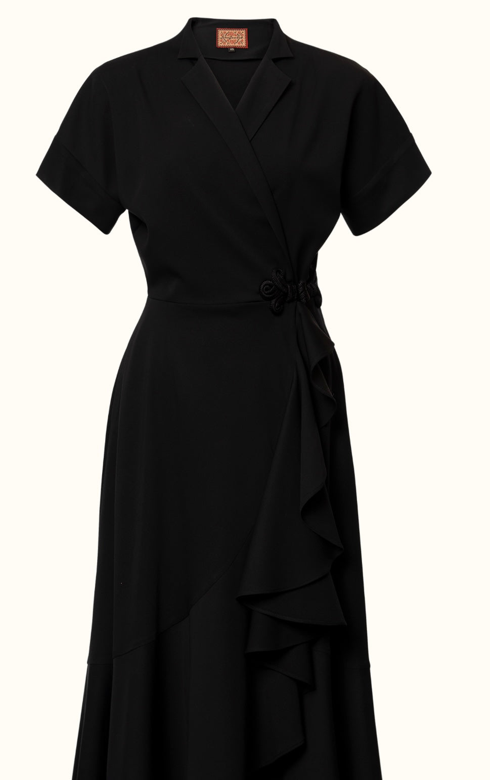 Das “Carolina” Kleid aus der Lena Hoschek Herbst/Winter 2025 Kollektion verkörpert romantischen Minimalismus in Perfektion. In klassischem Schwarz gehalten, trifft ein Wickeloberteil mit seitlichem Verschluss auf einen fließenden Überrock, der sanft einen darunterliegenden Layer enthüllt. Ein femininer Look mit eleganter Bewegung und kraftvoller Präsenz.