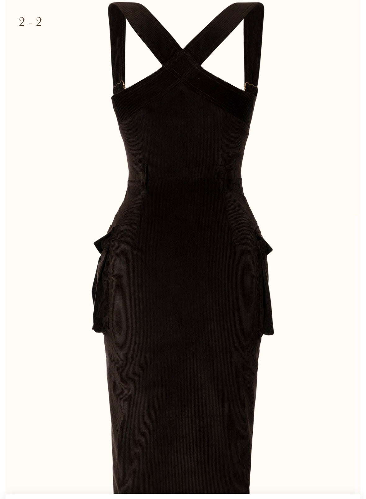 Das "Factory" Kleid aus der Lena Hoschek Herbst/Winter 2025 Kollektion zeigt sich in einer femininen Midi-Länge mit durchgehendem Frontreißverschluss und geknöpften Taschen. Breite, überkreuzte Träger und Gürtelschlaufen verleihen dem funktionalen Design eine elegante Note – ein modernes Statement mit handwerklichem Erbe.