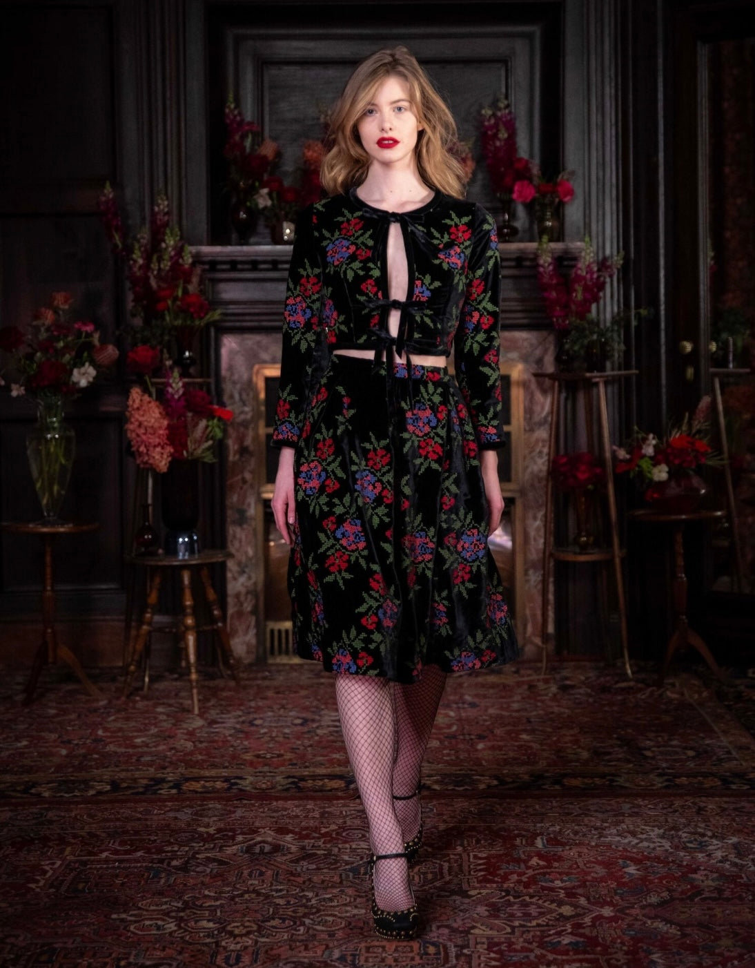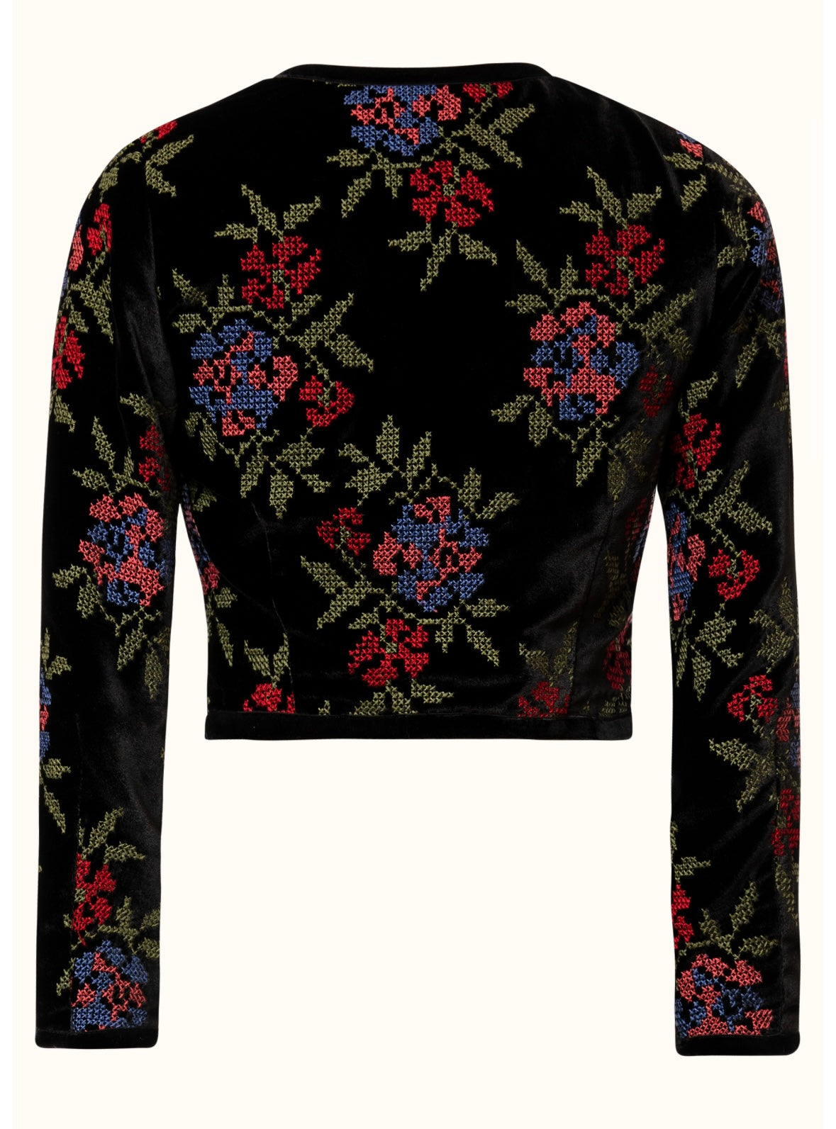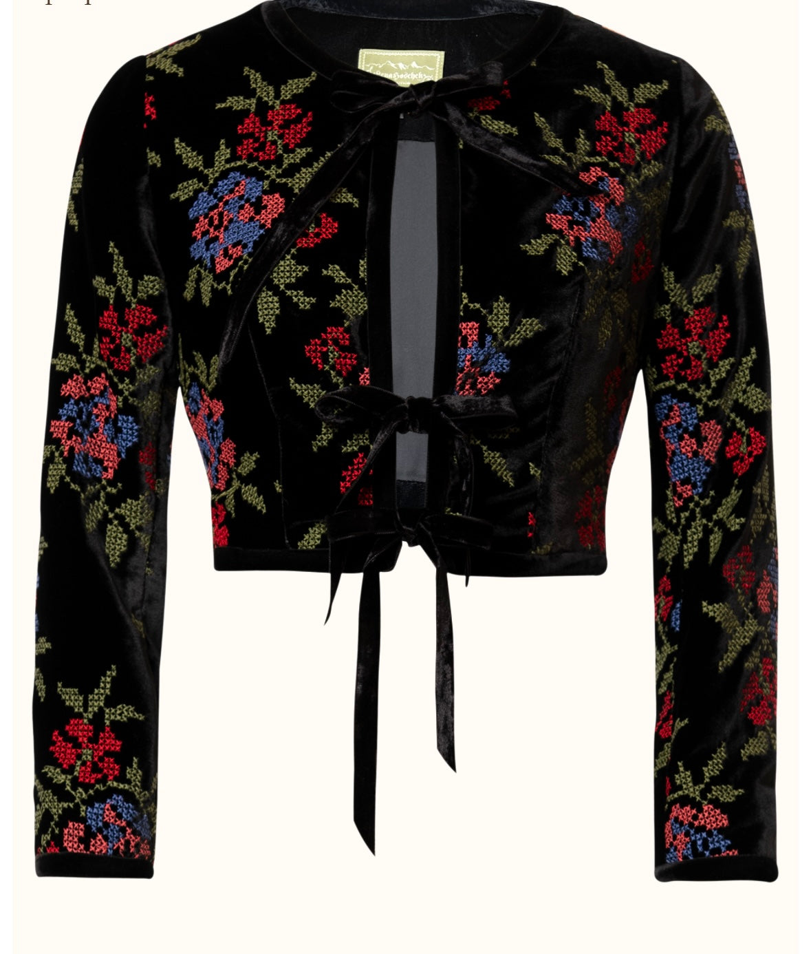 Die „Trixie“ Jacke aus der Lena Hoschek Herbst/Winter 2025 Kollektion ist mit drei dekorativen Schleifenverschlüssen versehen. Das traditionelle Stickmuster auf schwarzem Grund betont ihren folkloristischen Charme.