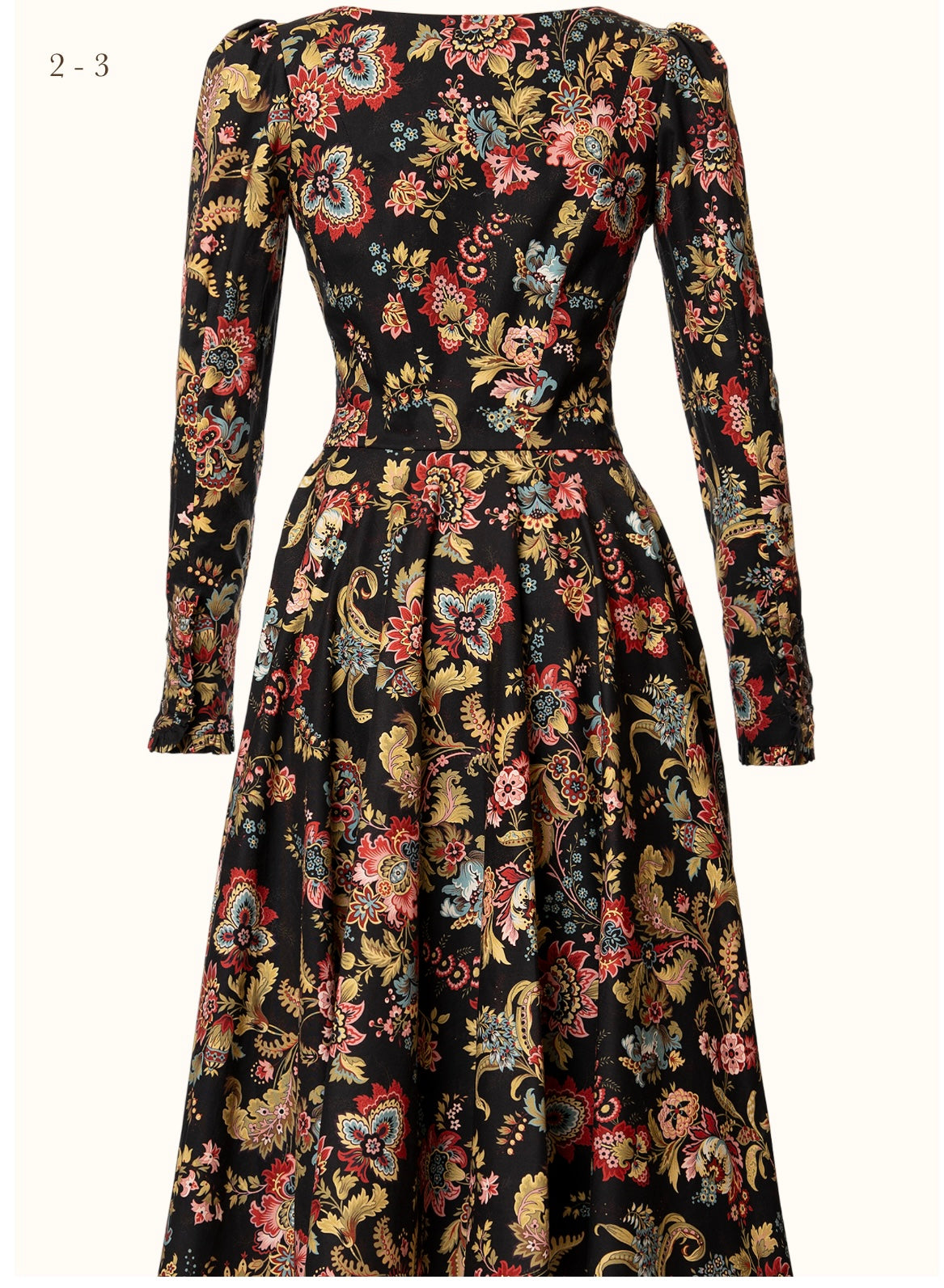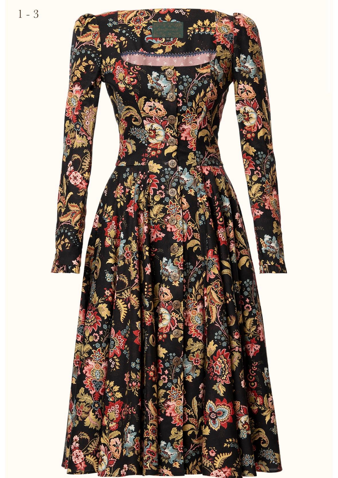 Das „Palina“ Kleid aus der Lena Hoschek Herbst/Winter 2025 Kollektion zeigt einen eckigen Ausschnitt und ein figurnahes Oberteil, das in einen vom Bänderrock inspirierten Rock übergeht. Lange Ärmel enden in eleganten Faltenmanschetten. Eine durchgehende Knopfleiste mit heritage-inspirierten Knöpfen verleiht dem Midikleid besondere Raffinesse.